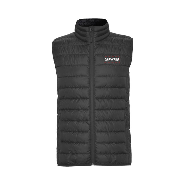 Bodywarmer in de kleur ebony met geborduurd Saab-logo in wit. De bodywarmer heeft twee voorzakken met een rits, een binnenzak en een contrasterende binnenvoering. Licht van gewicht, waterafstotend en winddicht. Nauwsluitend model.