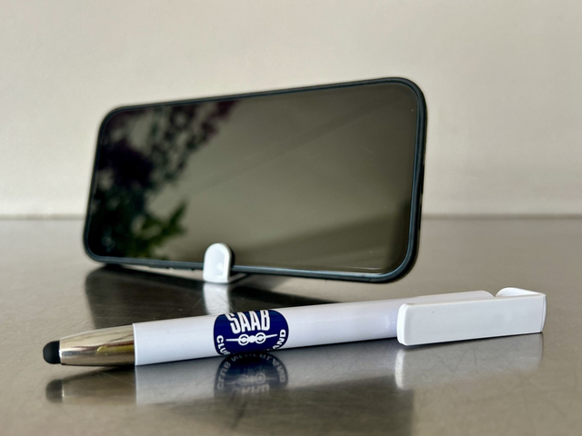 Met deze Stylus 3-in-1 van Saab Club Nederland heb je iets in handen! Naast een prima schrijvende pen is dit ook een stylus voor je telefoon of tablet. Met de clip - een handige houder voor je mobiele telefoon - heb je ook je handen vrij. Verkrijgbaar in wit met logo van Saab Club Nederland.