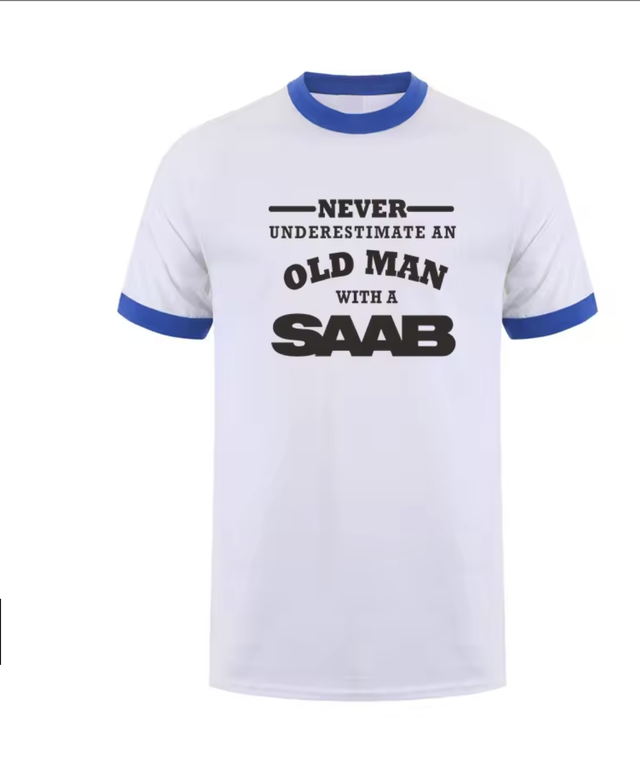 T-Shirt met korte mouwen in wit met blauwe biezen langs de hals en de mouwen, bedrukt met de tekst: 'Never Underestimate an Old Man with a Saab". 100% katoen.
