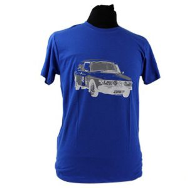 T-Shirt met korte mouwen in de kleur kobalt blauw, bedrukt met Saab 99, alleen nog verkrijgbaar in maat S.